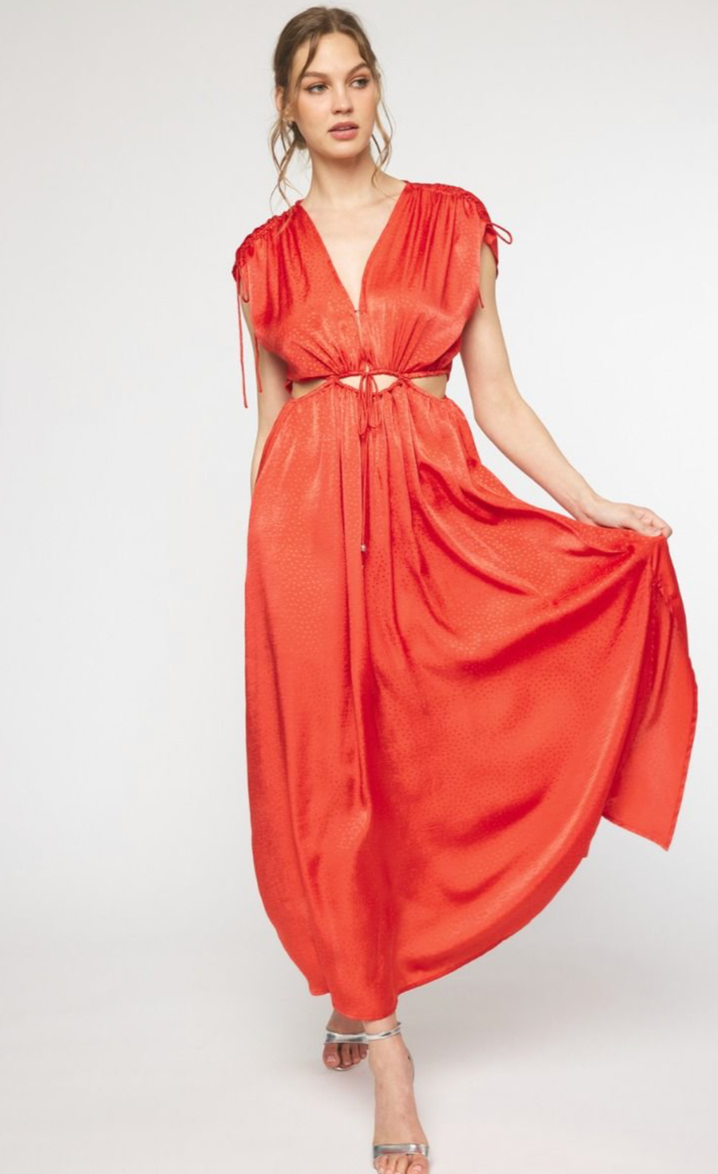 Print satin v-neck 1/2 sleeve maxi dress featuring cutout front and drawstring details. Slit at front. Hook and eye closure at bust. Lined. Woven. Non-sheer. Lightweight.