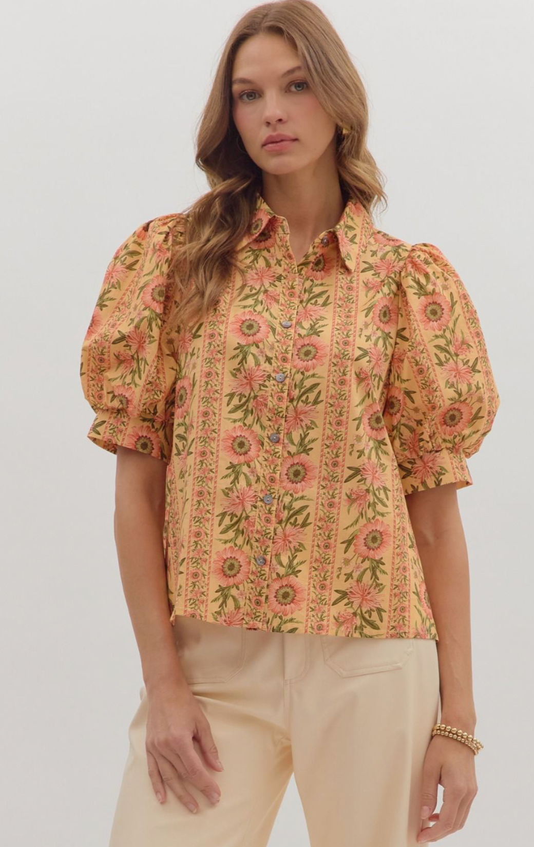 Floral print short puff sleeve top featuring pleated back yoke and button closure at front. Unlined. Woven. Semi-sheer. Lightweight.