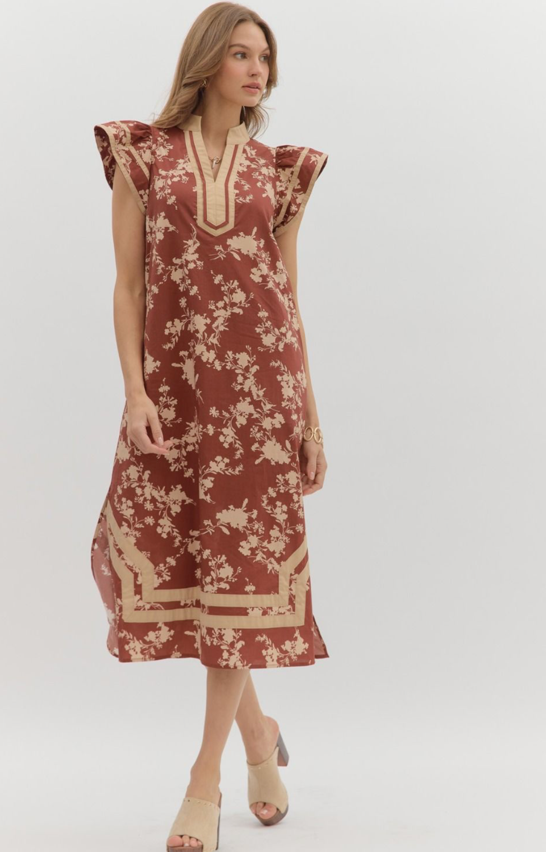 Floral print flutter sleeve pullover midi dress featuring a contrast-accent caftan-inspired band.