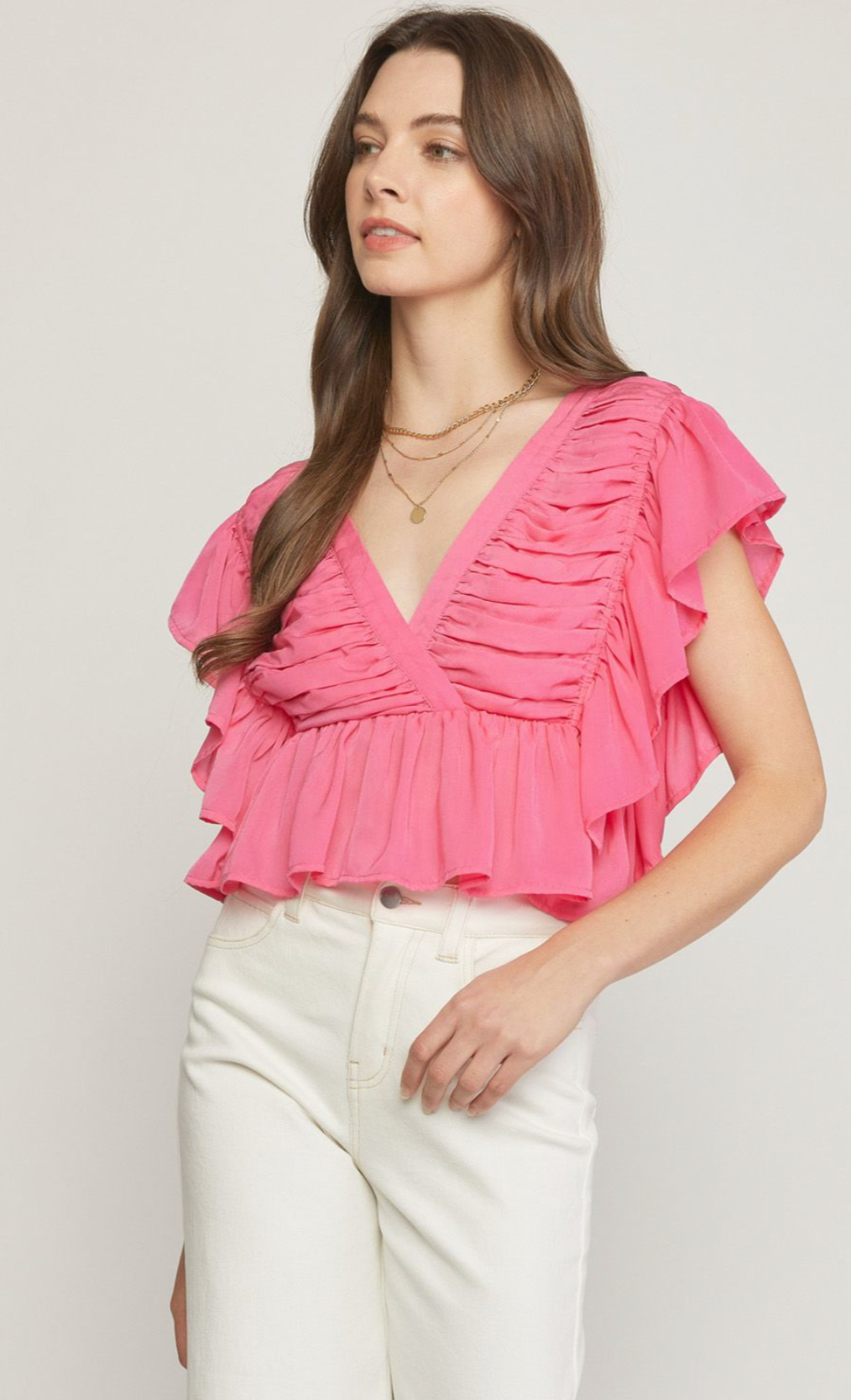 Solid v-neck butterfly sleeve top featuring pleated detailing and self tie at back. Lined. Woven. Non-sheer. Lightweight.