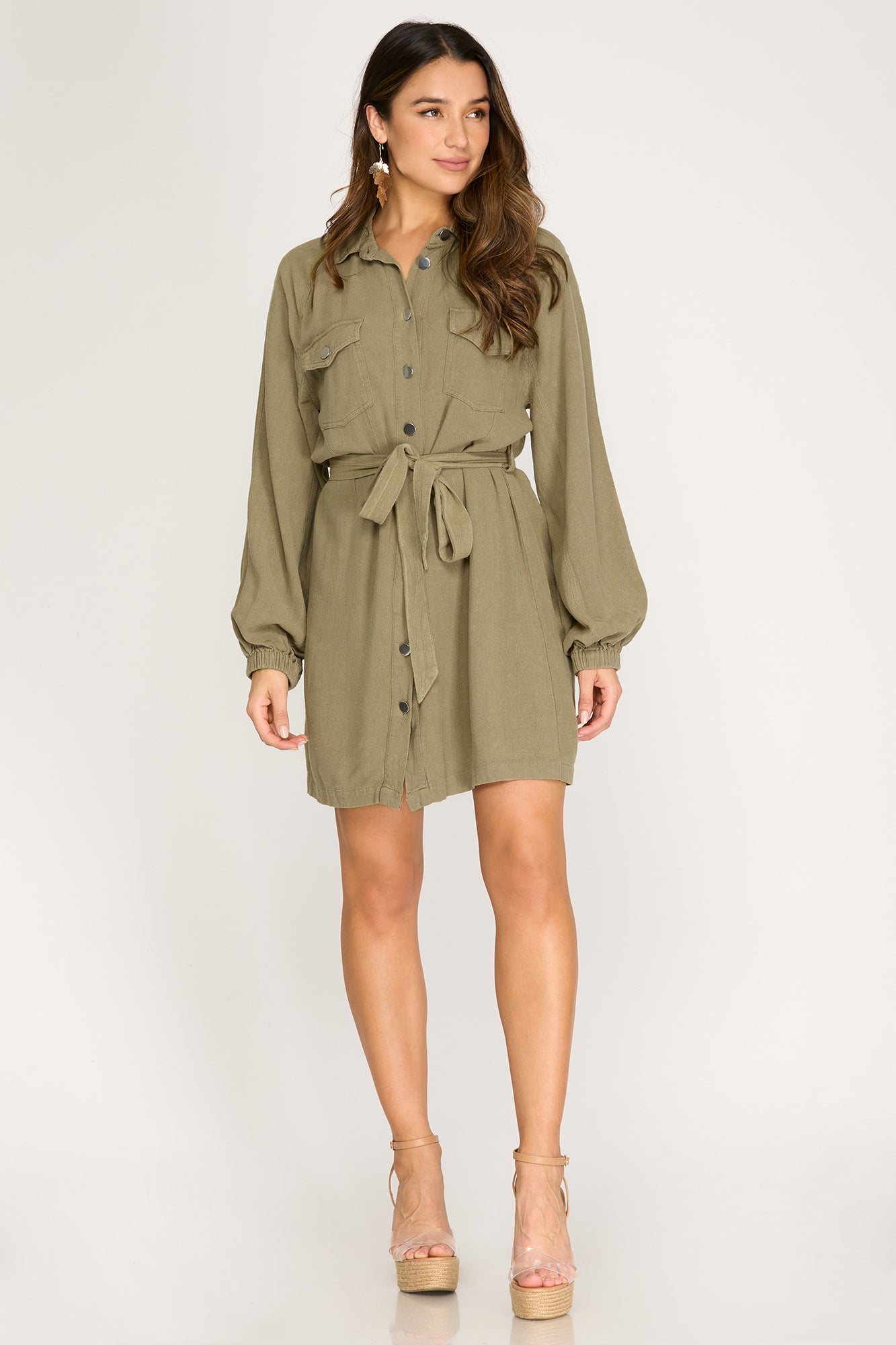 Long sleeve button down washed shirt dress with waist tie