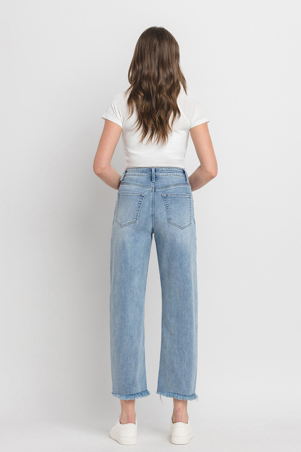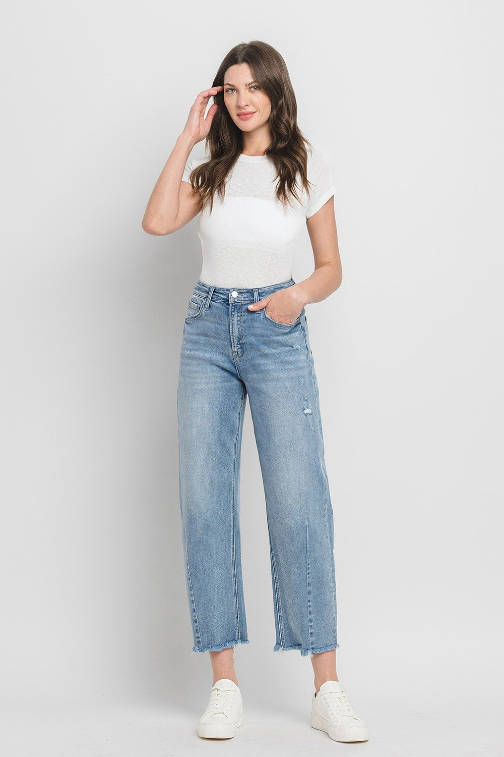 SUPER HIGH RISE BARREL LEG JEANS COMFORT STRETCH DENIM, SUPER HIGH RISE WAIST, SLIGHTLY DISTRESSED DETAIL, FRAYED HEM, CROPPED LENGTH, BARREL LEG JEANS