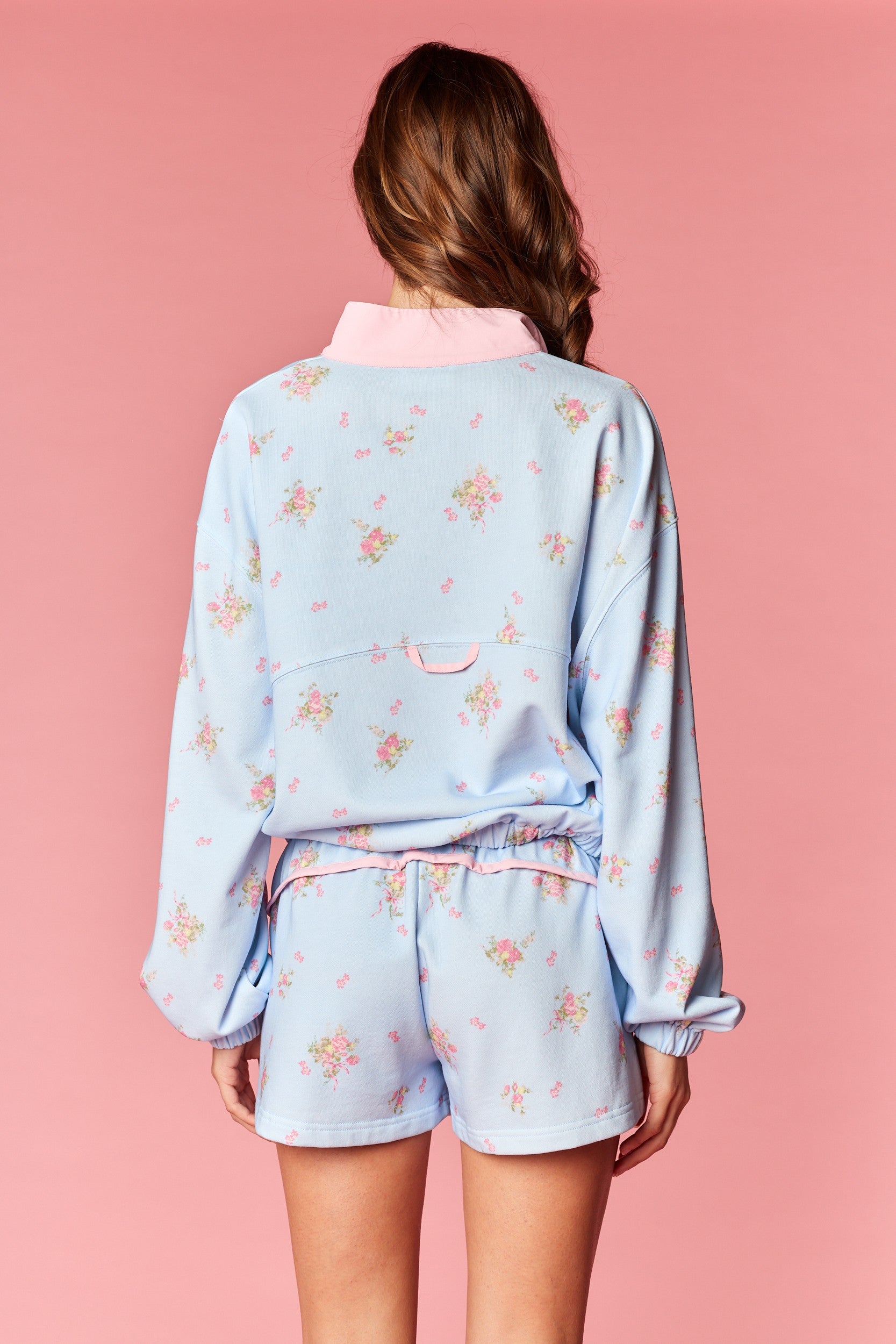 - Two-piece lounge set featuring a soft pastel blue fabric with a delicate floral print for a romantic, cozy mood - Long-sleeve pullover top designed with snap-button placket and contrast pink collar for a playful, vintage-inspired touch - Relaxed fit top with elasticized cuffs and subtle volume sleeves for comfortable, everyday wear - Matching shorts feature an elastic waistband with contrast pink trim for an easy, flattering fit - Side pockets on shorts add practicality while maintaining a soft, feminine silhouette - Lightweight, smooth fabric offers breathable comfort, ideal for lounging, casual wear, or at-home styling