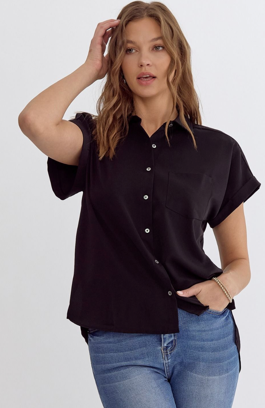 Solid button down collared top featuring pocket detail at bust. Slits at sides. Pleat detail at back. Unlined. Woven. Non-sheer. Lightweight.