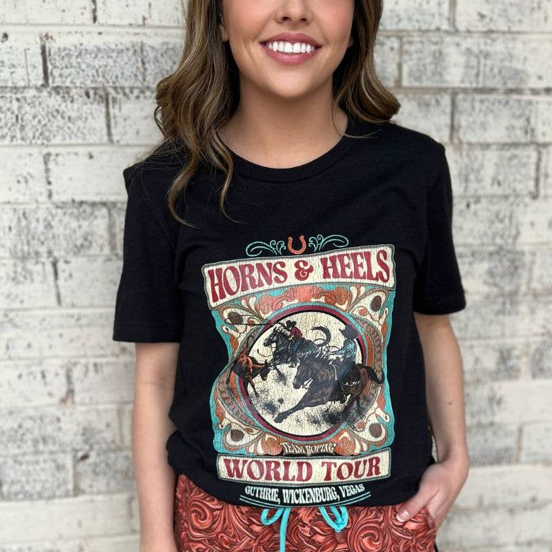 Get ready to stand out in style with our Horns And Heels Tee! This team roping tee is cute and comfy, perfect for any occasion. So don't blend in with the crowd, grab our quirky and fun shirt today!